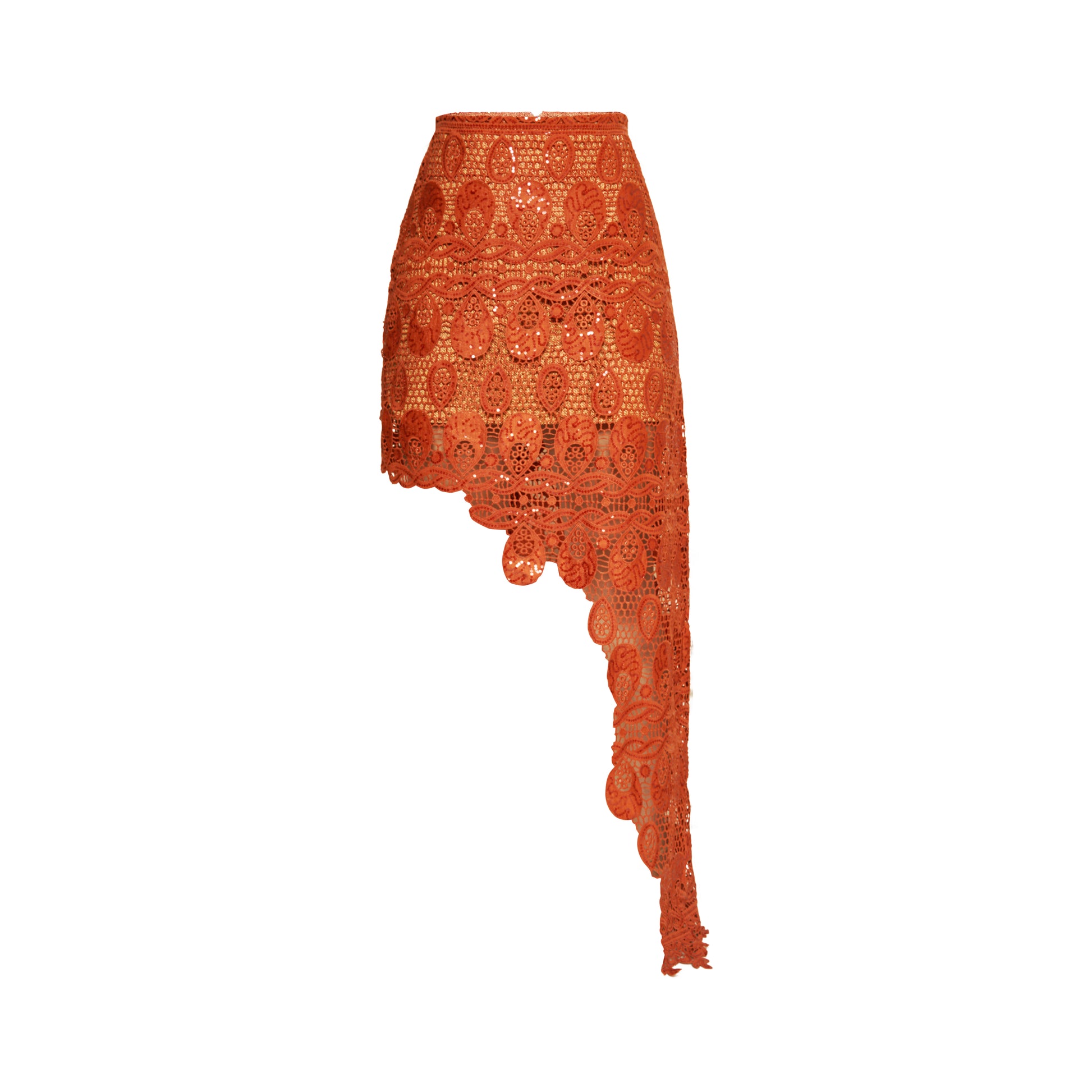 Elevate your wardrobe with this striking asymmetrical burnt orange lace skirt. Perfect for versatile styling, this skirt is handcrafted with luxurious lace fabric featuring subtle sequin and 3D raw hem line details. The intricate material, sourced from Nigeria, is complemented by a fully lined 100% cotton layer in cream and copper tones, ensuring both comfort and elegance.