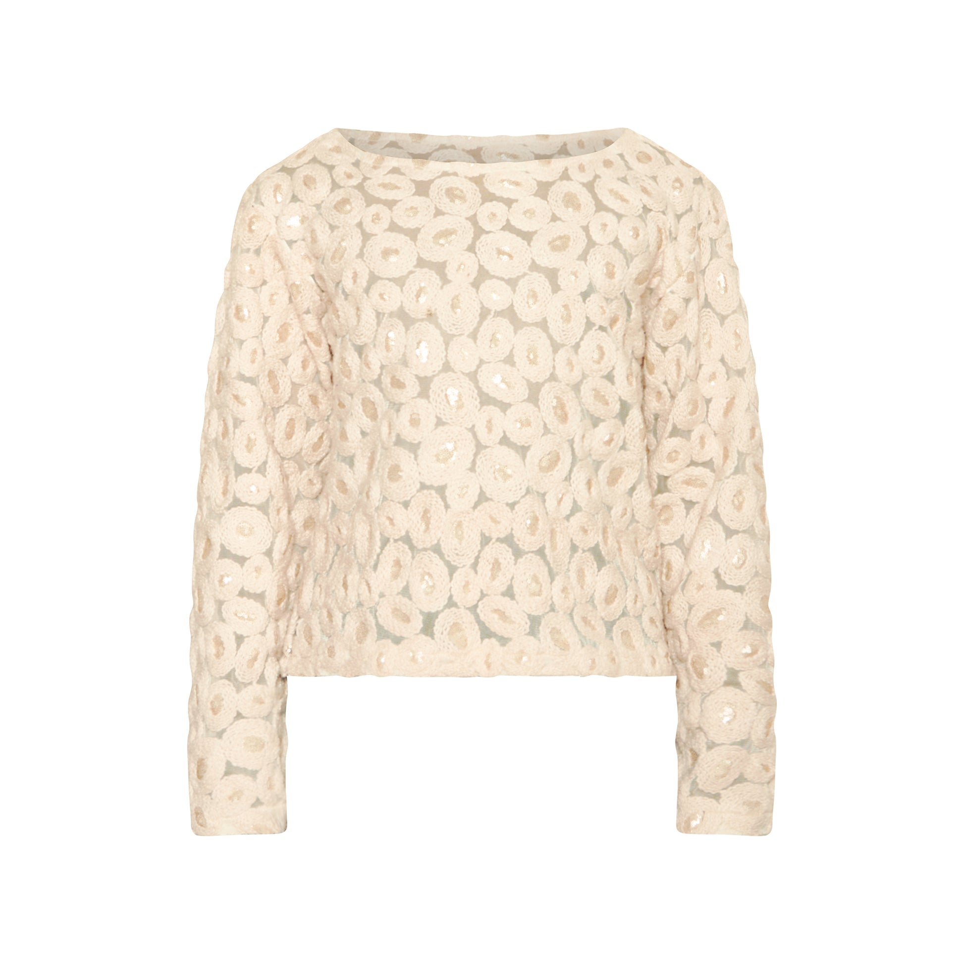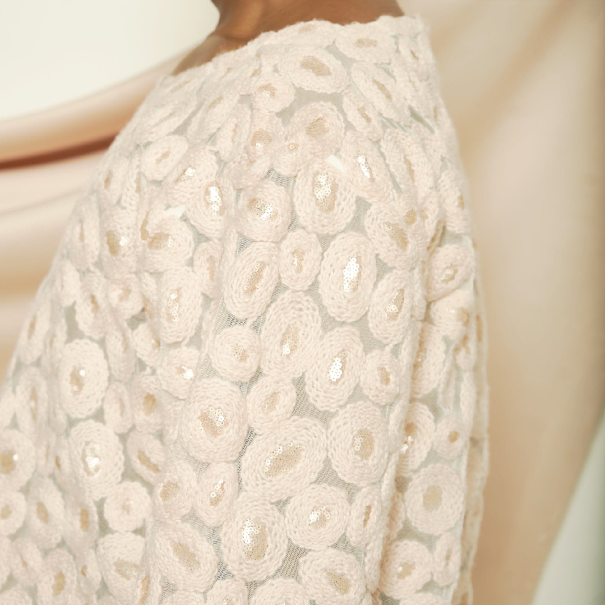 Elevate your wardrobe with this unisex long sleeve knit shirt, designed for those who appreciate both style and subtle detail. Crafted with a unique circular knit pattern and adorned with delicate sequin details, this shirt adds a touch of understated glamour to any look. At first glance, it appears as a classic cream color, but upon closer inspection, you'll notice a soft pale pink undertone, adding depth and warmth to the piece.