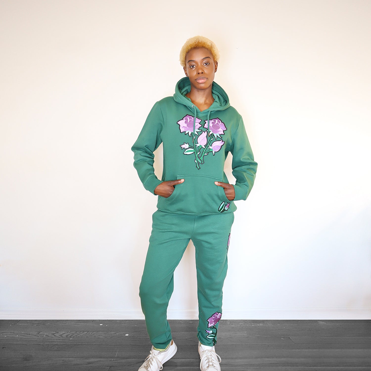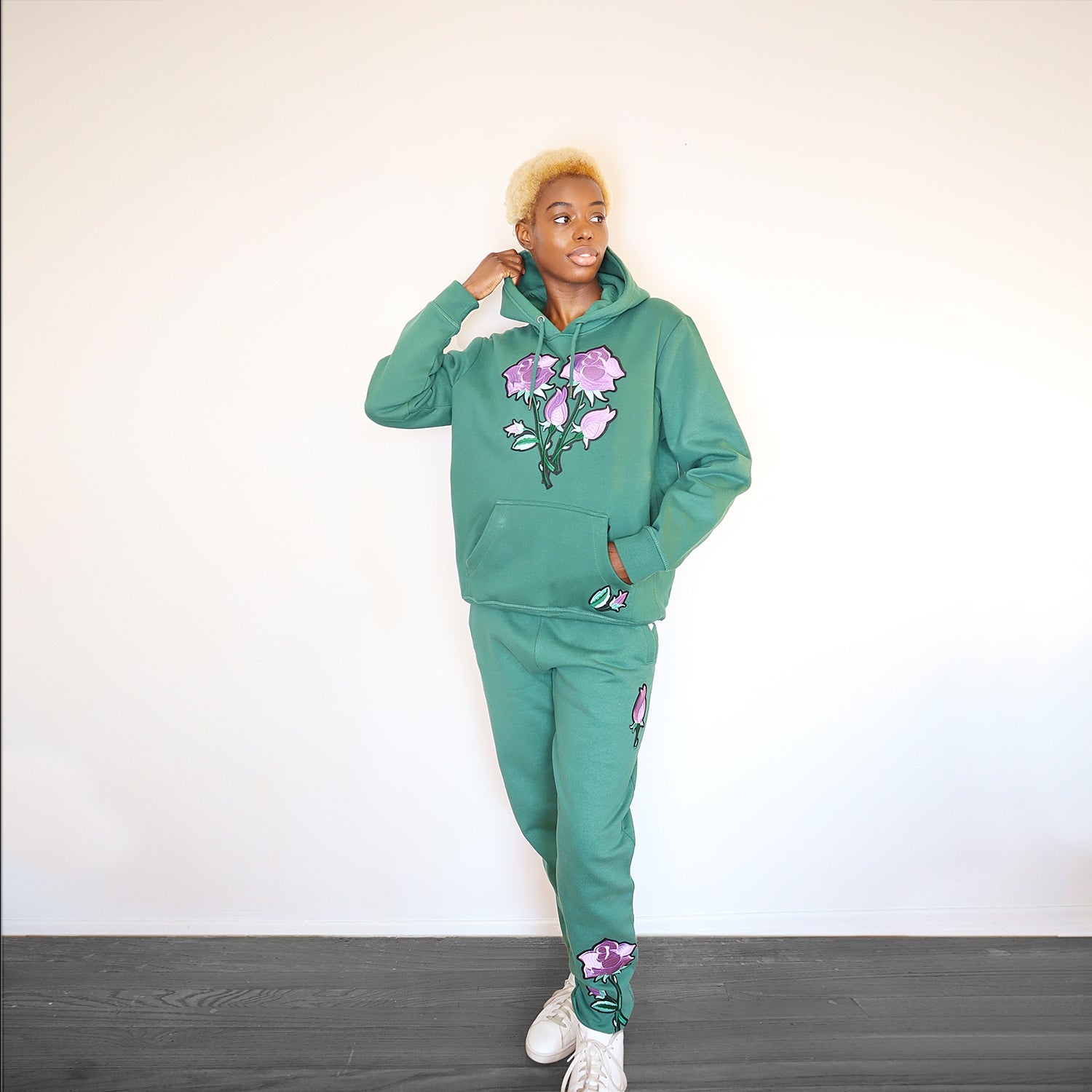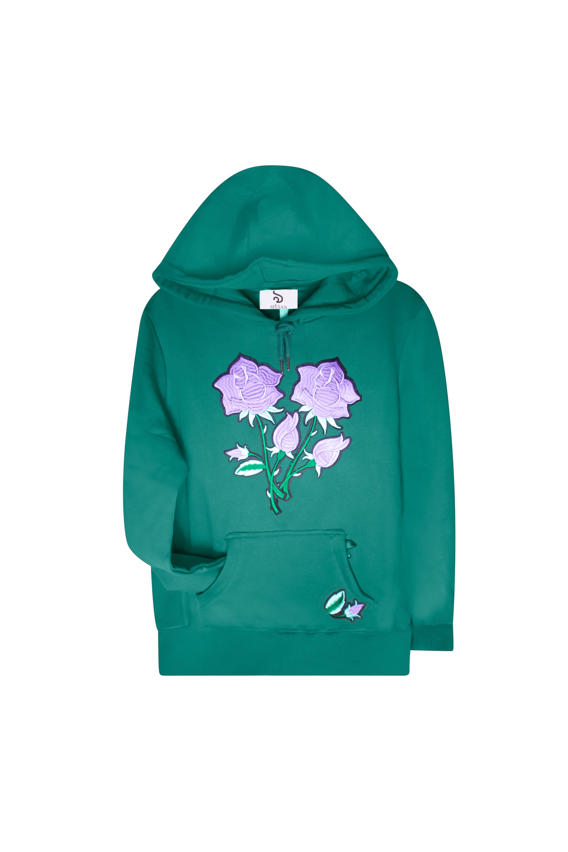 Elevate your casual wardrobe with this bold green sweatshirt crafted from luxurious 100% Organic Supima cotton for ultimate softness and comfort. The calm green hue is beautifully contrasted by intricate lavender colored flowers on the chest.